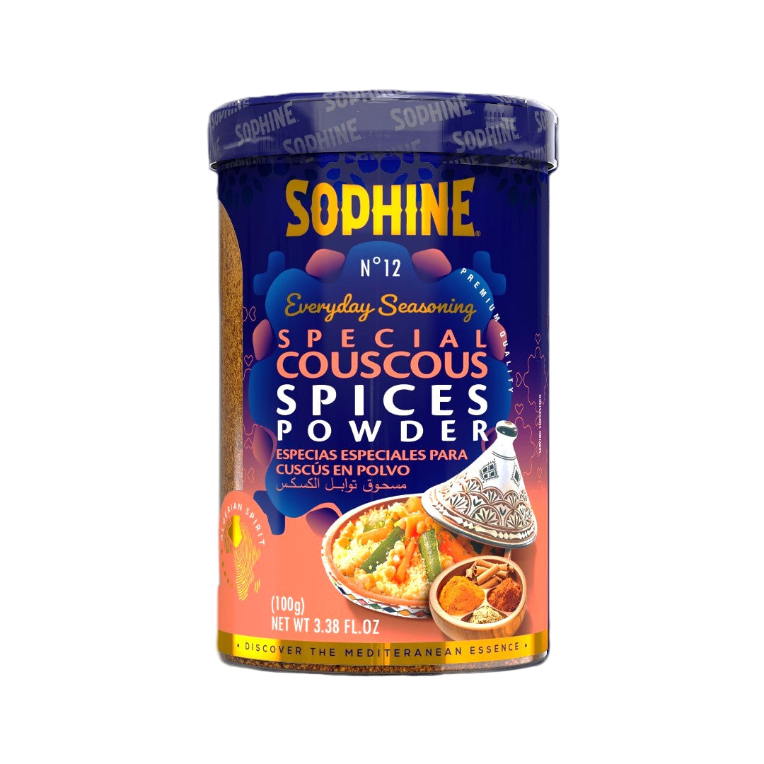 Authentic SOPHINE mixed spices specially formulated for couscous, bringing together the perfect blend of traditional North African spices. This expertly crafted seasoning mix enhances the natural flavors of couscous with aromatic herbs and spices that have been used for generations. Essential for creating authentic, flavorful couscous dishes.